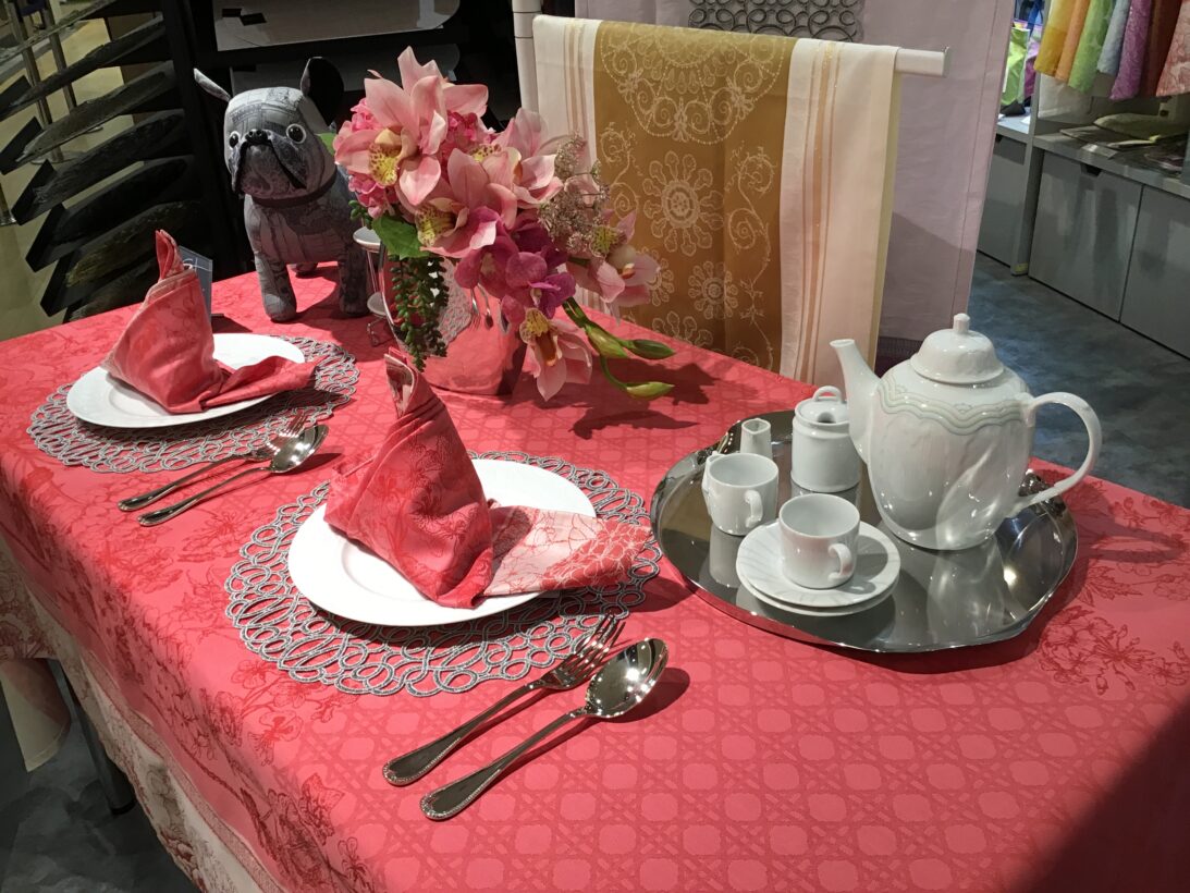 鮮やかなピンク色にゼラニウムのデザインが華やかな、春らしいクロスです。
